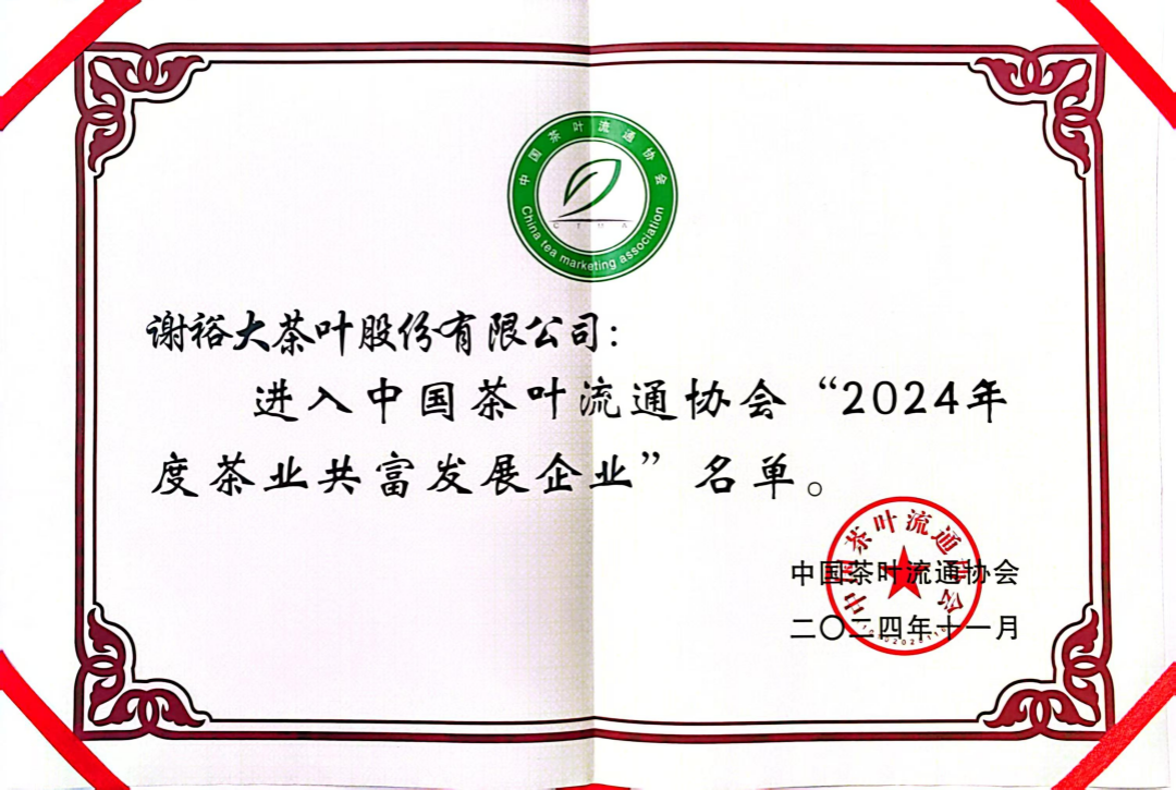 在11月30日的茶产业高质量发展交流会上,谢裕大荣获中国茶叶流通协会颁发的“2024年度茶业共富发展企业”荣誉。谢裕大在发展的过程中始终不忘联农带农,不仅抓住“公司+基地+农户”联合体新型经营模式,分工协作共同实现区域茶产业与相关产业的融合发展,带动茶农脱贫增收,实现群众致富、村集体增收、企业发展多方共赢成果。同时,坚持稳中求进的发展思路,对黄山毛峰茶产业联合体内农户进行贷款担保和贴息方式对农民提供支持,变“输血”为“造血”,变“主导”为“引导”,以企带村推动乡村振兴。