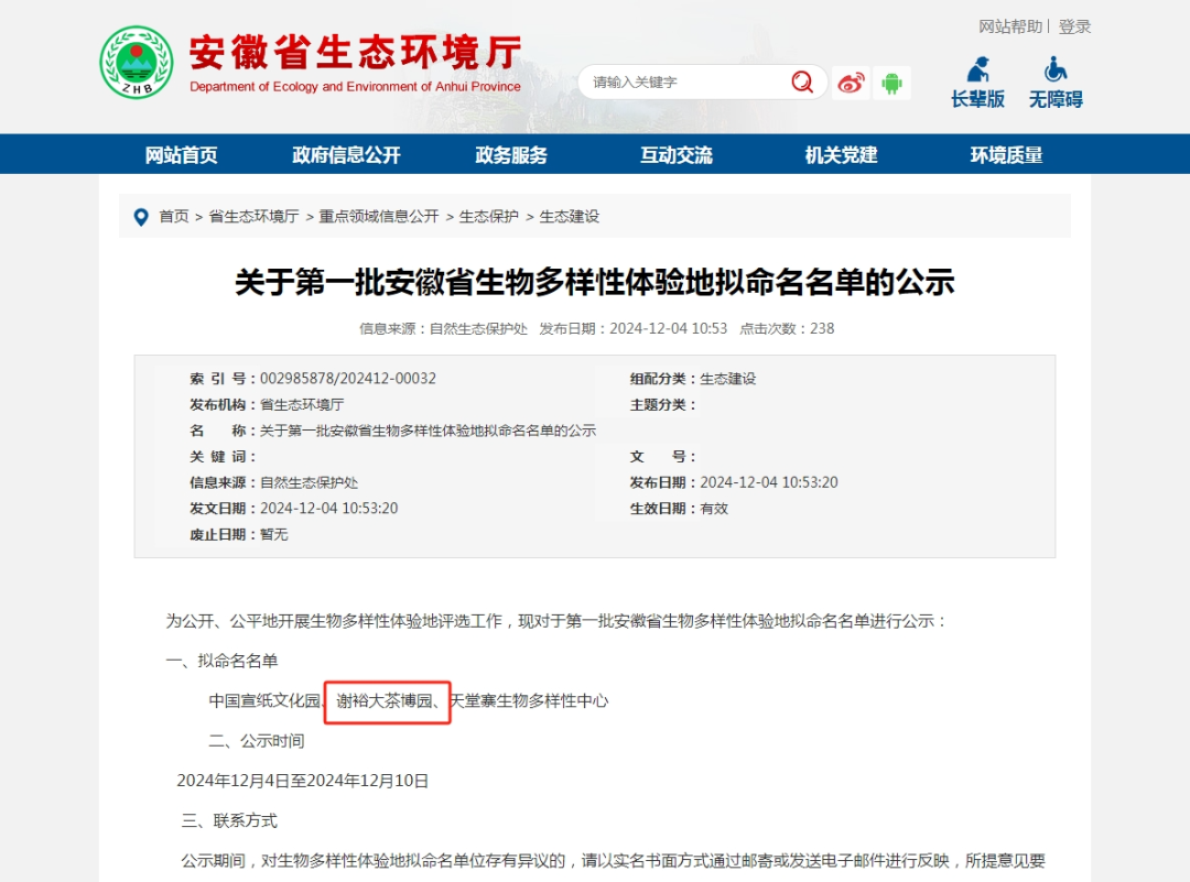 近日,安徽省生态环境厅公示了第一批安徽省生物多样性体验地拟命名名单,谢裕大茶博园凭借特色生态资源及丰富的茶文化荣幸入榜,成为全省唯一一个生态茶园类型生物多样性体验地!