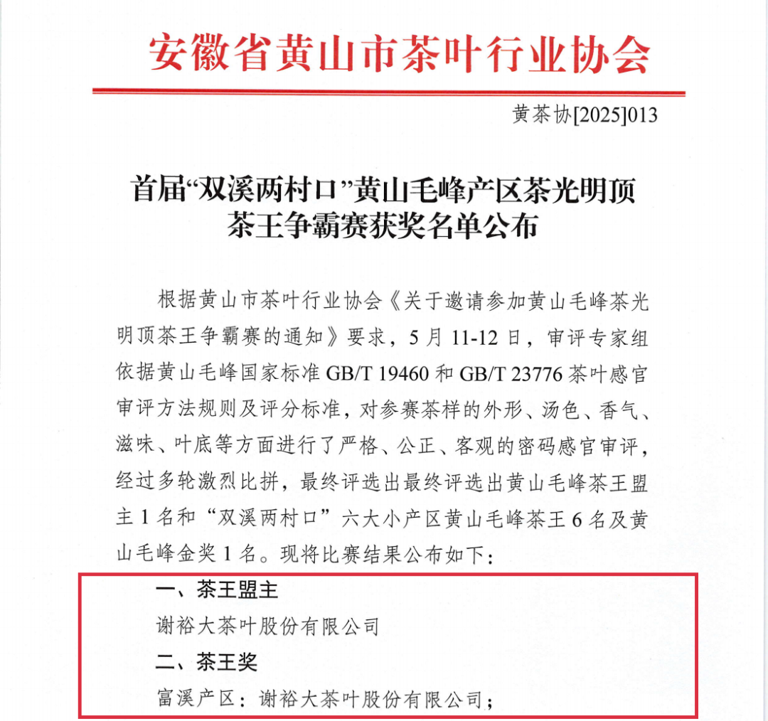 大赛审评专家组依据黄山毛峰国家标准GB/T19460和GB/T23776茶叶感官审评方法规则及评分标准,对参赛茶样的外形、汤色、香气、滋味、叶底等方面进行了严格、公正、客观的感官审评。经过多轮激烈比拼,谢裕大凭借着卓越的茶叶品质,一举摘得 “茶王盟主”桂冠以及富溪产区“茶王”称号,再次彰显了其在黄山毛峰领域的非凡地位与实力。